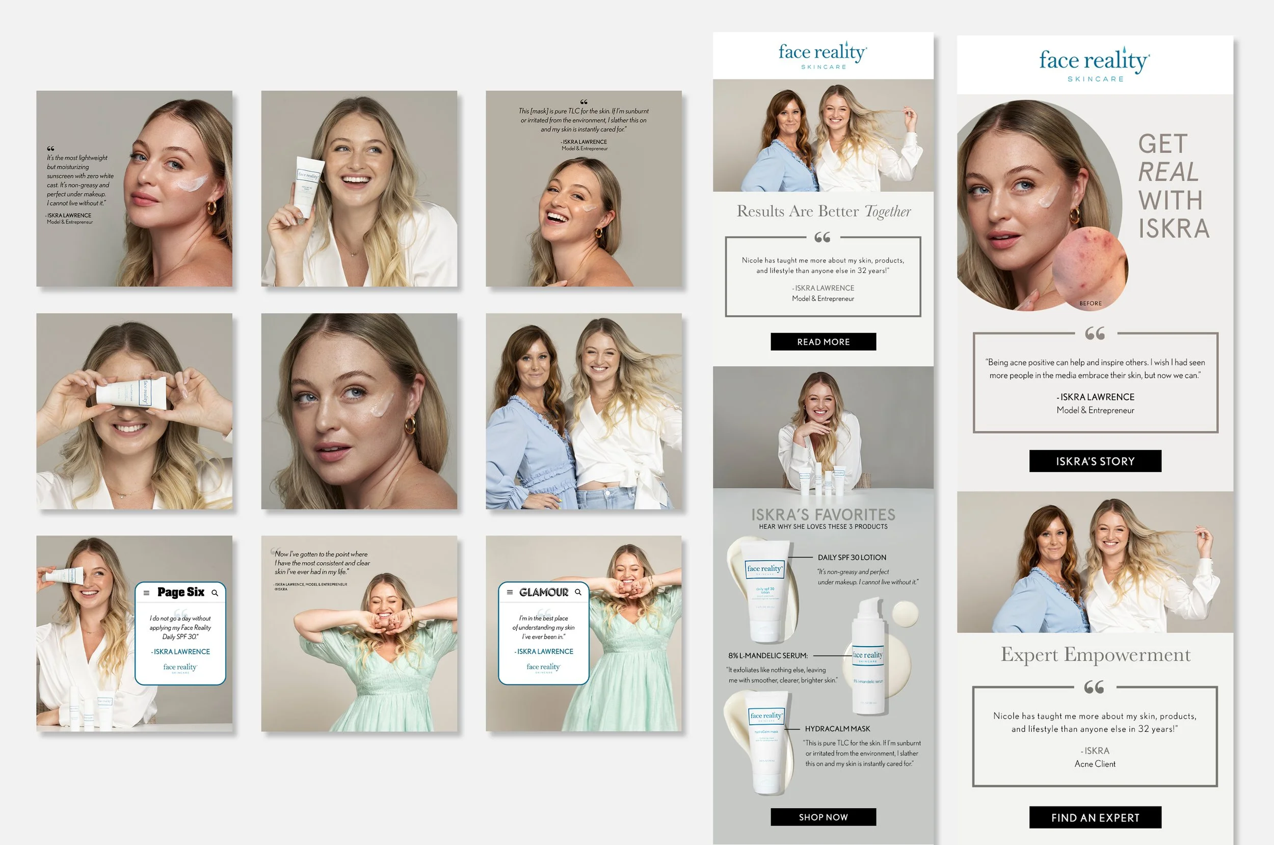 When shooting for this campaign, we wanted the photography to emanate the brand’s values of personal confidence and authenticity. We also wanted to highlight Iskra’s partnership with her Acne Expert, Nicole, encouraging our B2C consumers to find an esthetician near them.