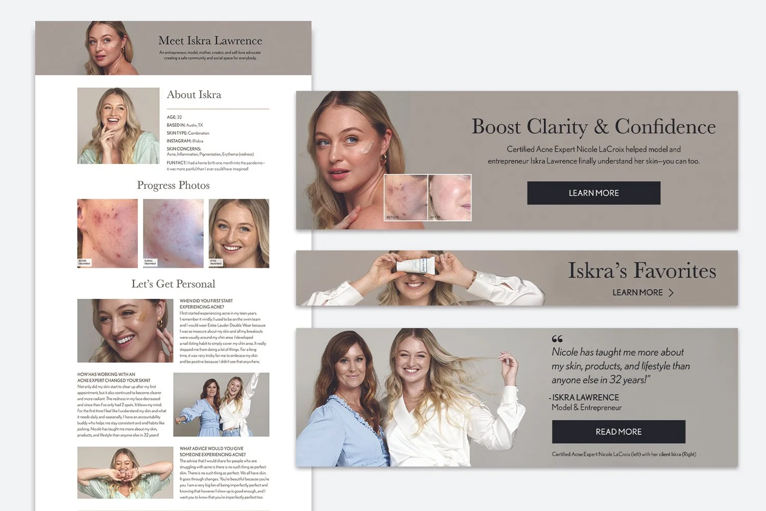 For this partnership, I created a dedicated landing page with Iskra’s personal story. It included her background, skin journey and struggles with acne, her path finding Face Reality, and her relationship with her Acne Expert, Nicole LaCroix. Additionally, we created various web modules leading to this landing page, A/B testing on what had the highest click through.